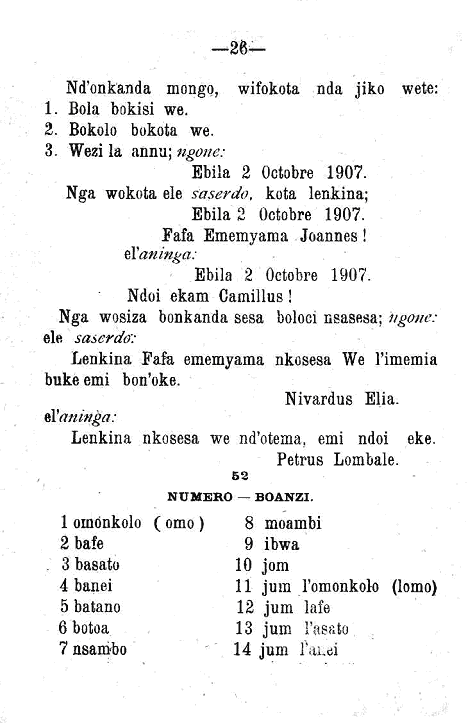 Langue: Le lomongo des environs de Mbandaka en une graphie rudimentaire.